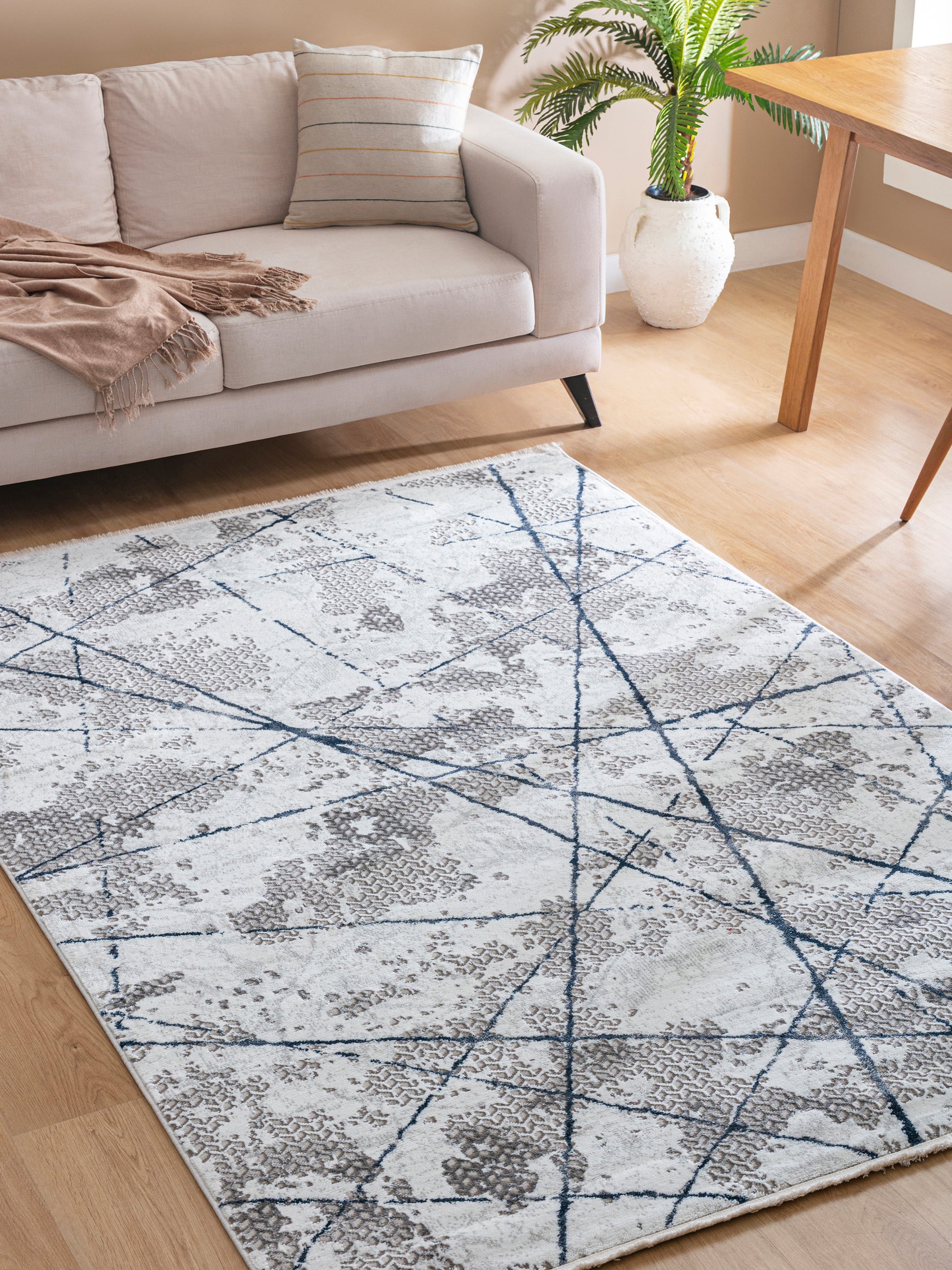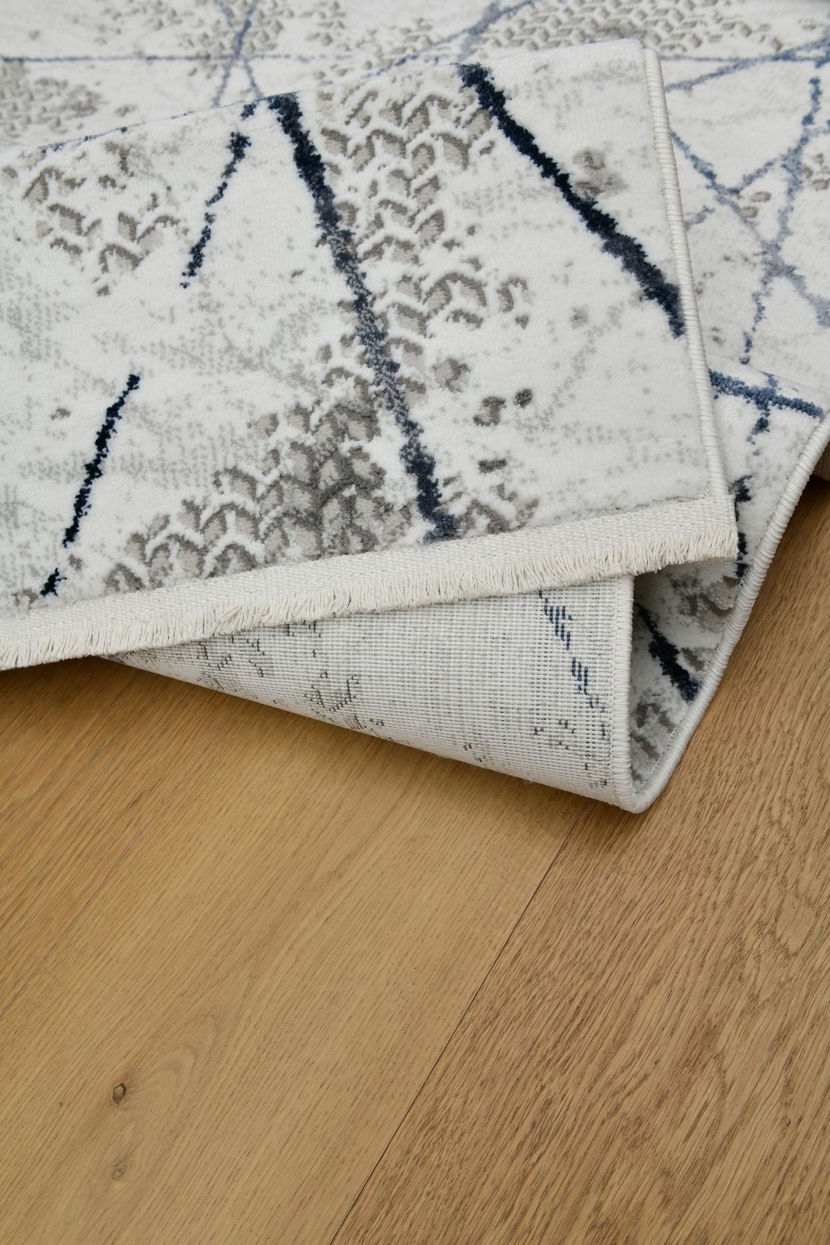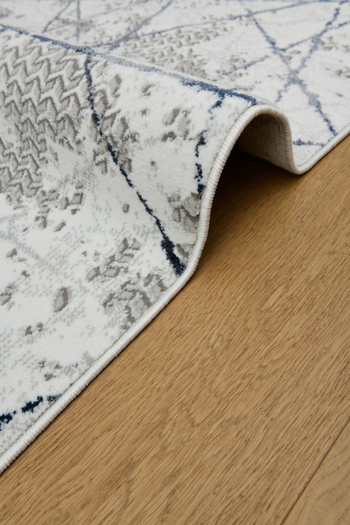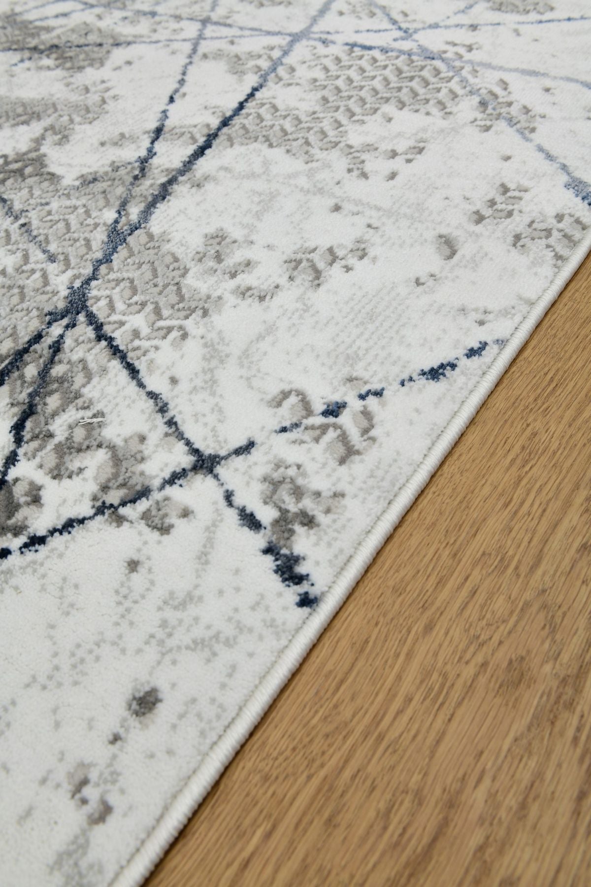 Astra SkuggLinj är en matta med starkt visuellt uttryck, där korsande linjer i blått möter abstrakta skuggmönster i grått och vitt. Den tredimensionella känslan och djupet i designen ger ett livfullt intryck, perfekt för moderna hem med karaktär.