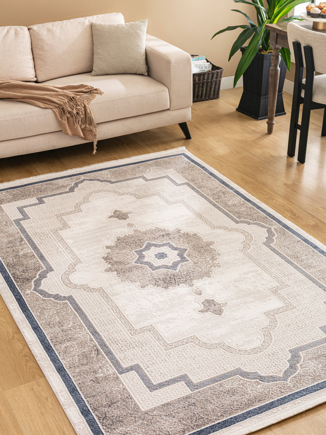 Bloom Stjärnväv är en sofistikerad matta med en klassisk central medaljong, inramad av mjuka nyanser i grått, beige och blått. Mönstret för tankarna till orientaliska vävar men med en modern tolkning som smälter in i dagens stilrena hem.