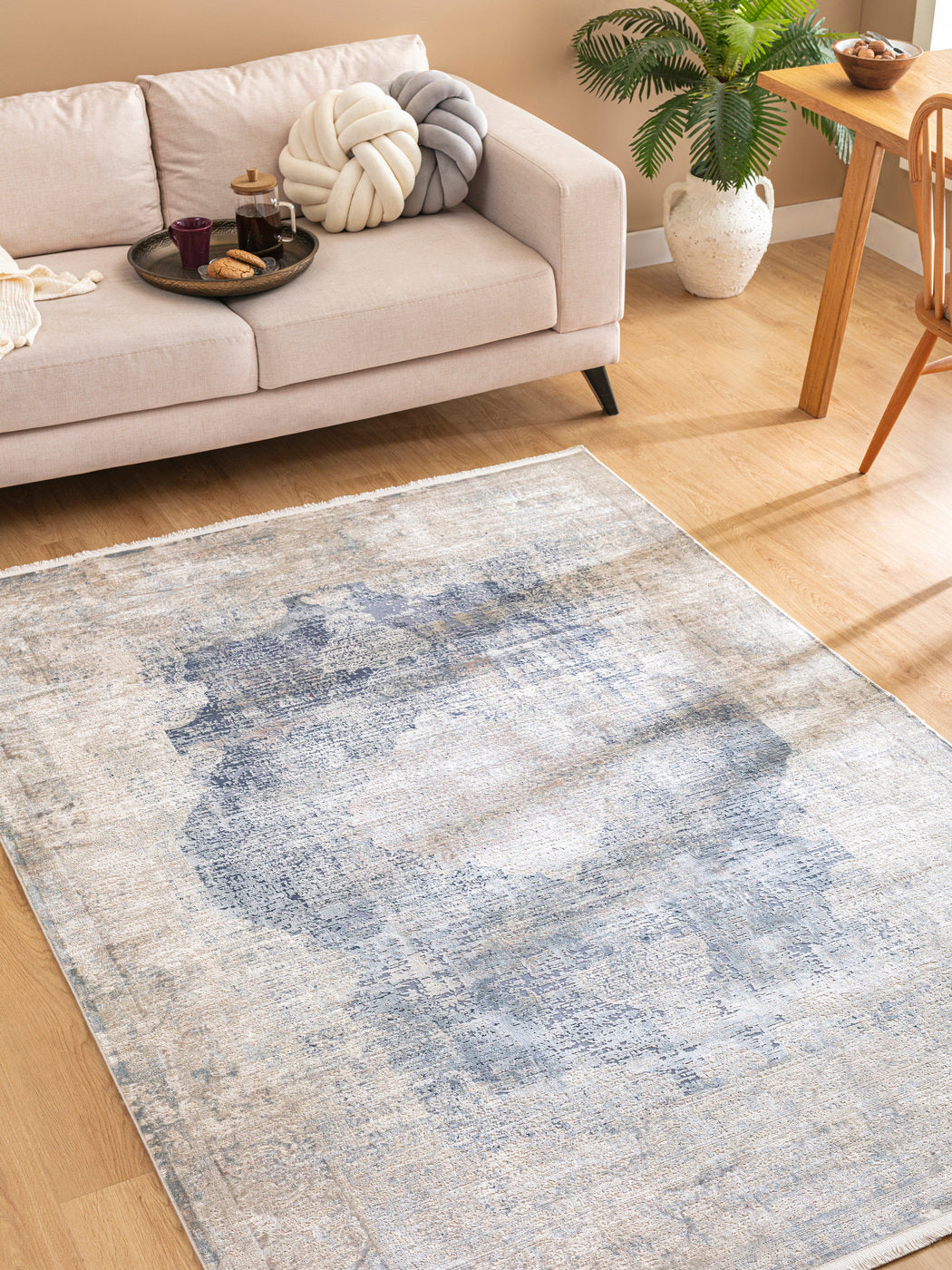 Bonneval DimBlå kombinerar en bleknad medaljongdesign med dova nyanser av blått och beige, vilket skapar en subtil vintagekänsla. Det distinkta men mjuka mönstret smälter naturligt in i moderna och klassiska inredningsstilar.