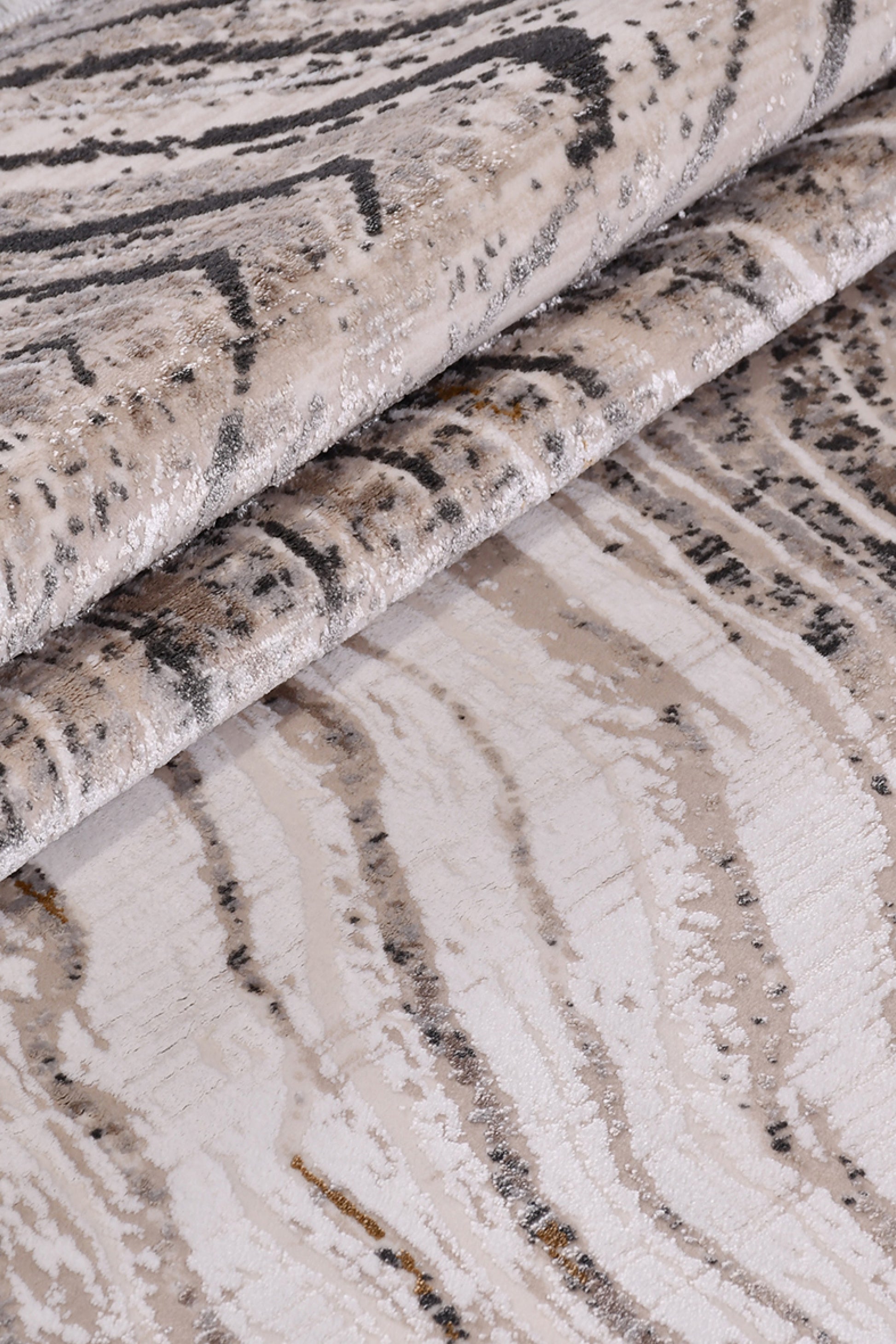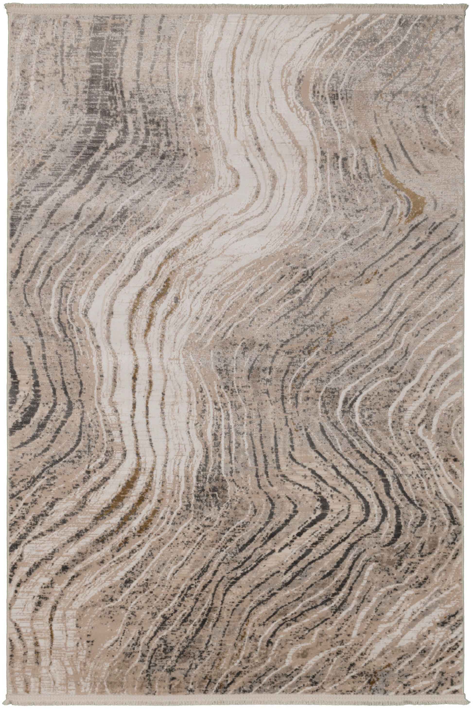 Cristal FlödeBeige fångar ögats uppmärksamhet med sitt flödande, nästan marmorerade mönster som påminner om strömmande vatten eller sandens naturliga linjer. Den harmoniska blandningen av beige, grått och inslag av guld ger mattan en levande men balanserad känsla.