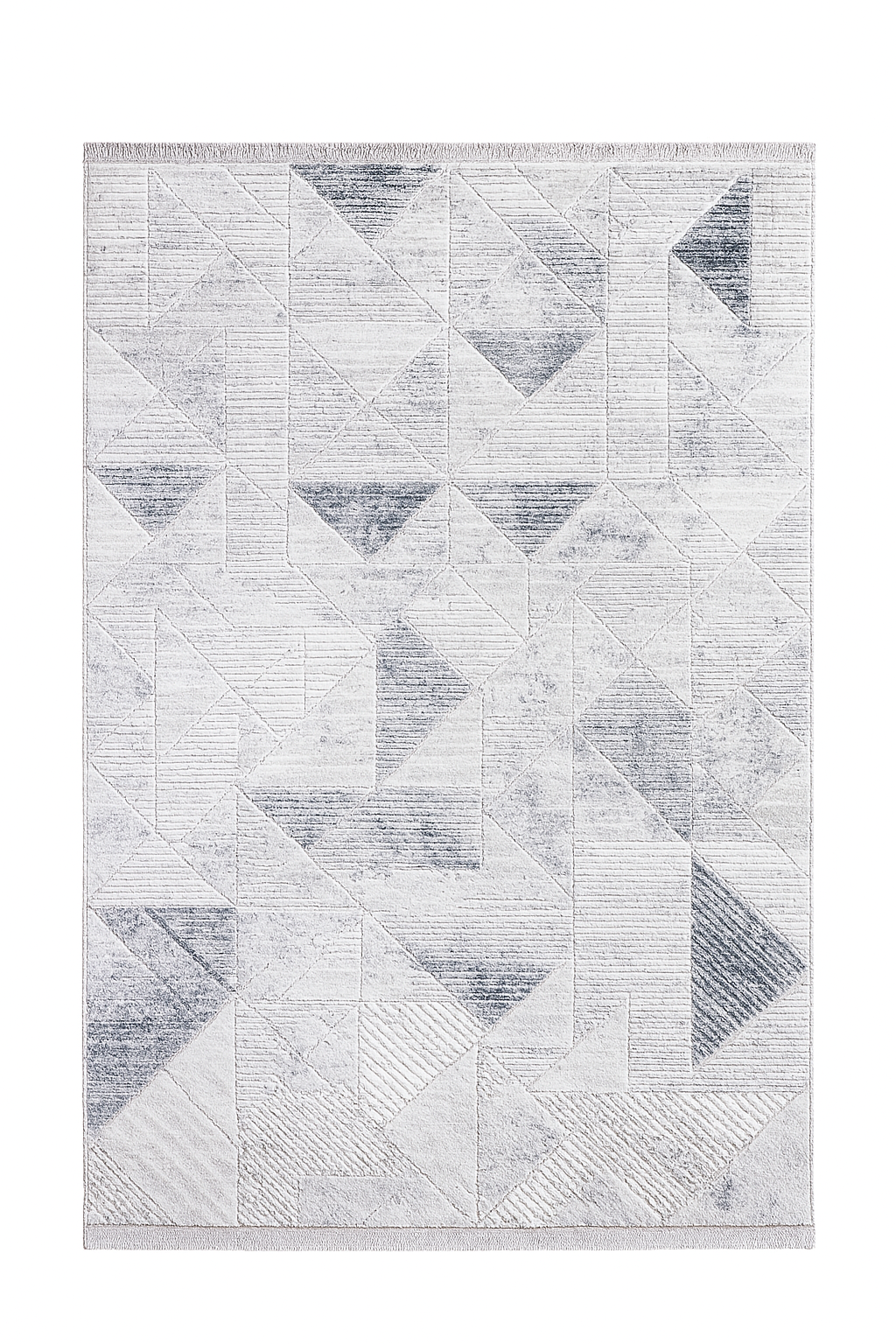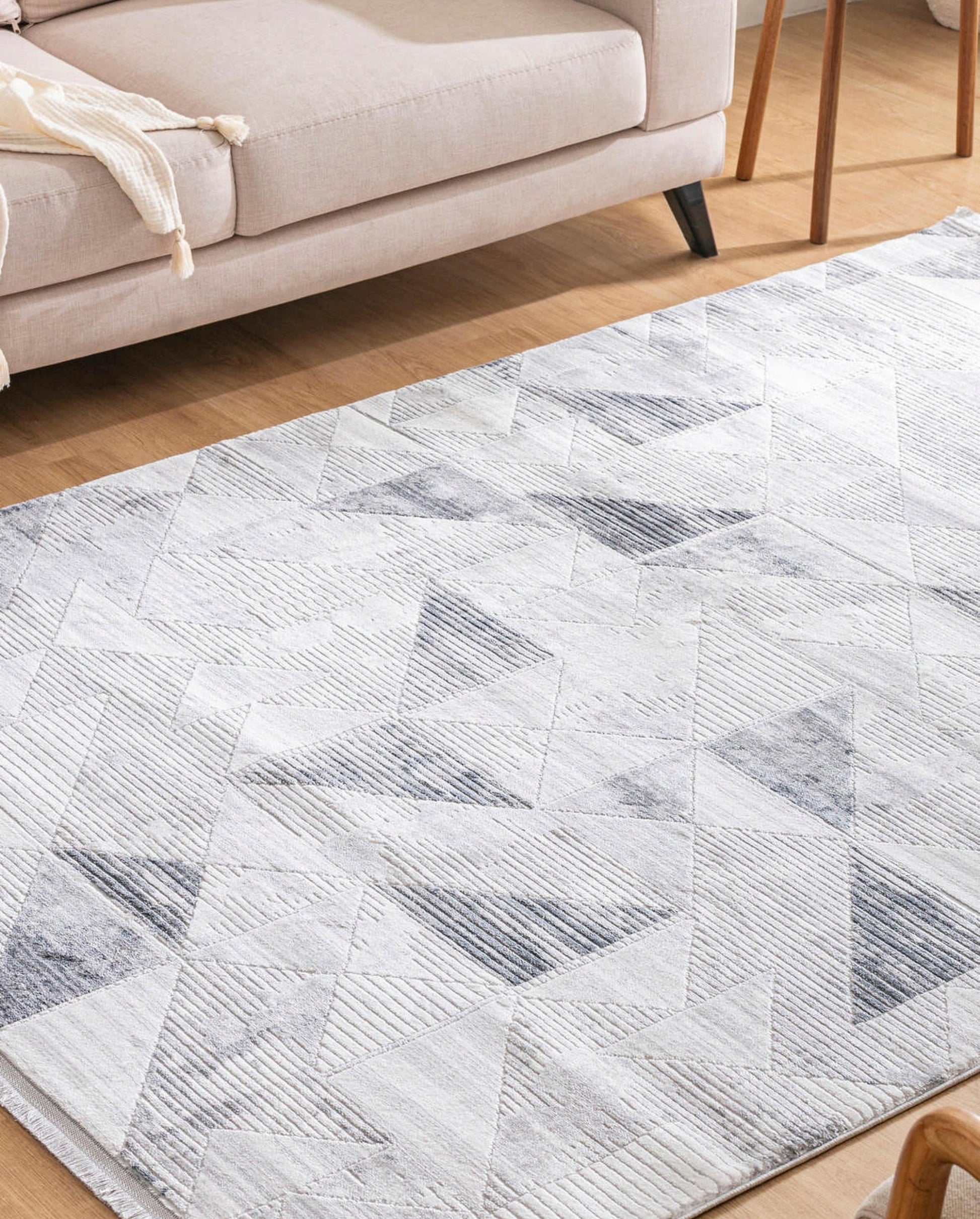 Juliet Isgrå för in ett modernt lugn i hemmet med sitt geometriska mönster i svala toner av grått och vitt. Den subtila tredimensionella texturen och de grafiska trianglarna skapar en harmonisk balans mellan form och funktion.