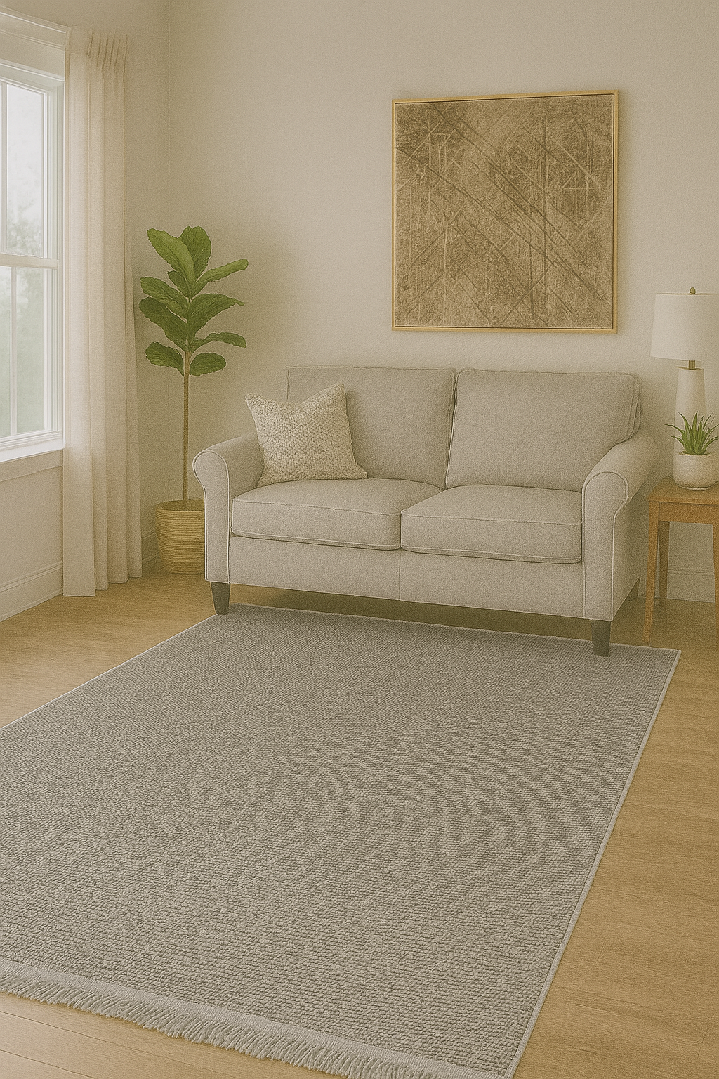 Selanik Aura – Stilren Handvävd Matta i Grå Ton med Franskant och Naturlig Känsla