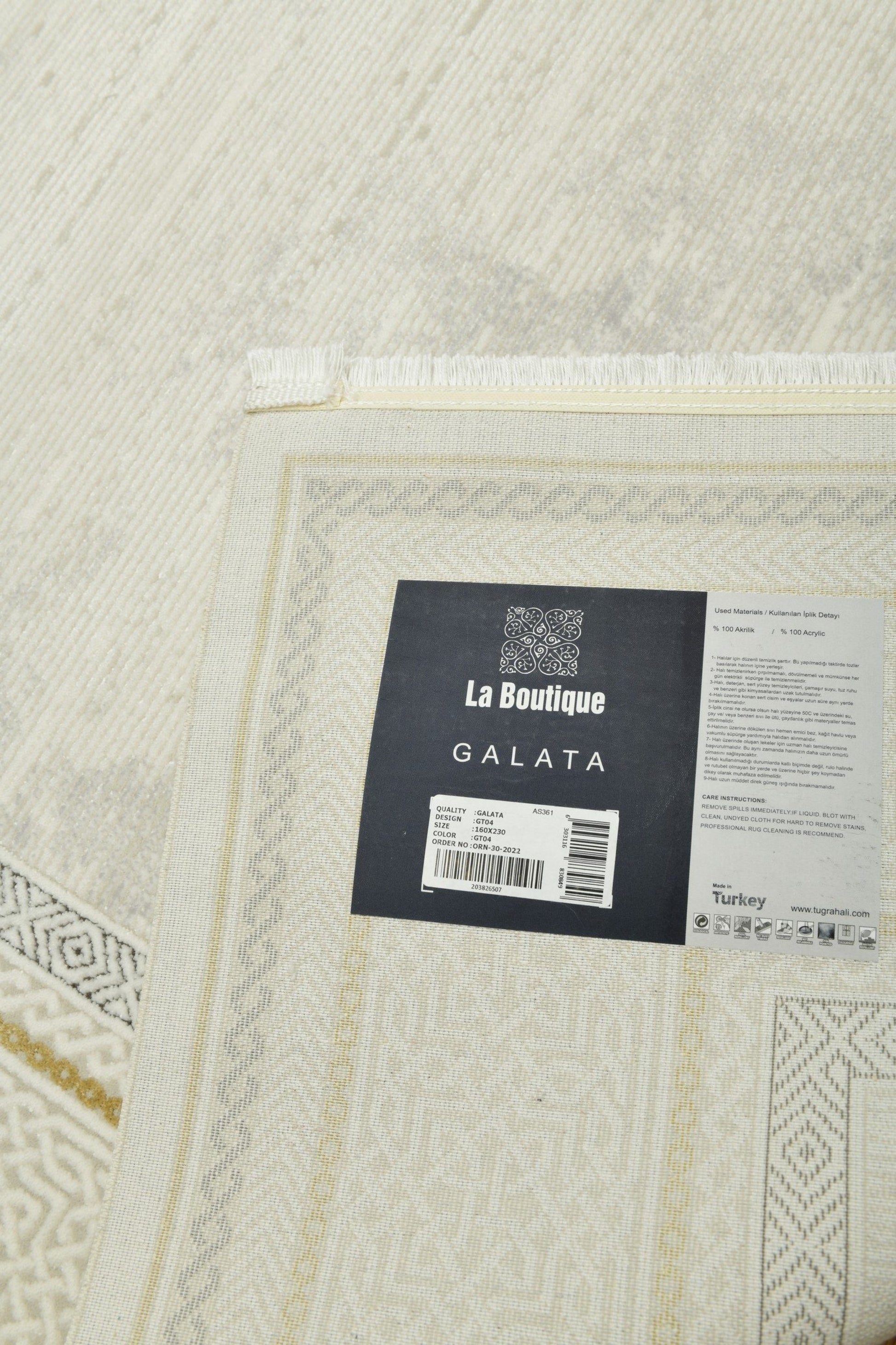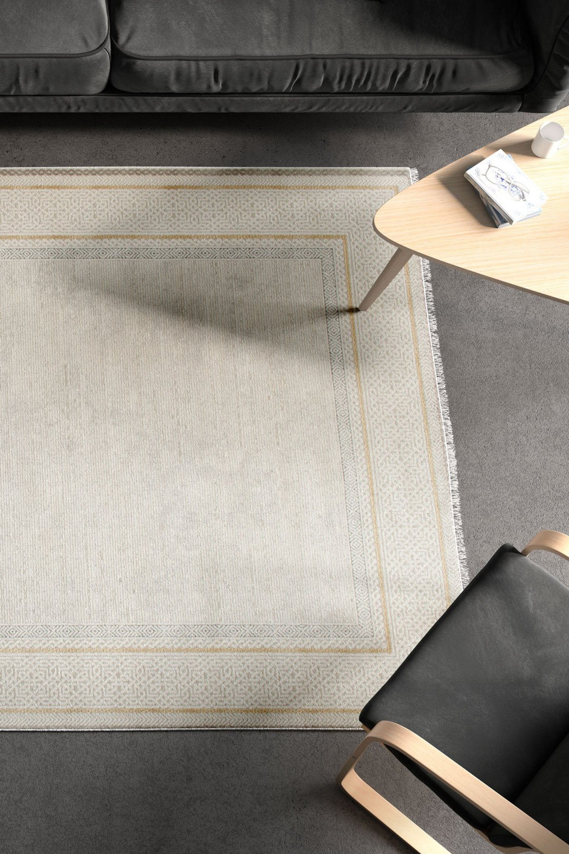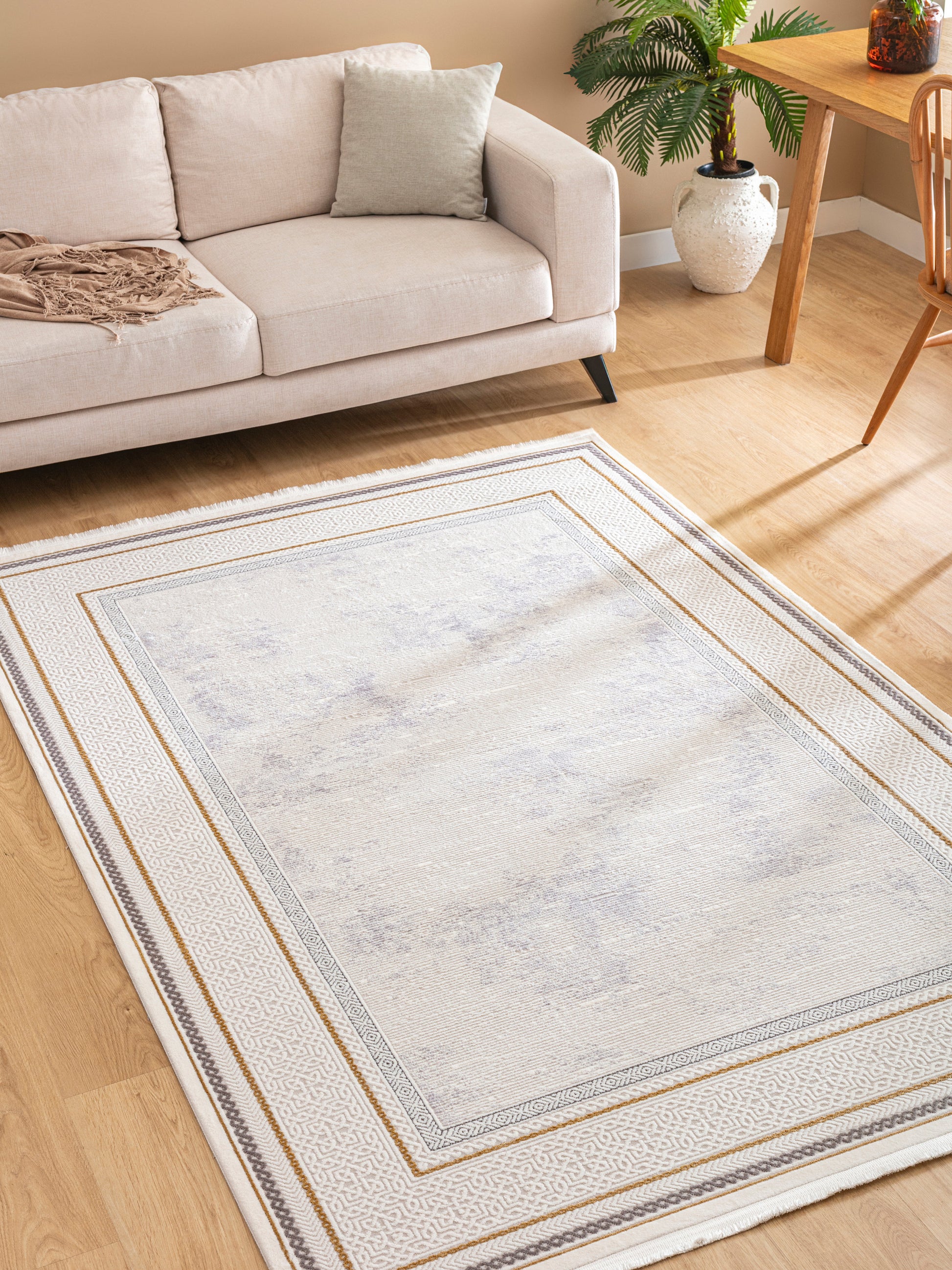 Galata SandRam kombinerar enkelhet med raffinerade detaljer. Den ljusa mattan ramas in av en dekorativ sandfärgad bård med subtila geometriska mönster, vilket skapar ett harmoniskt och elegant uttryck utan att kännas tungt.