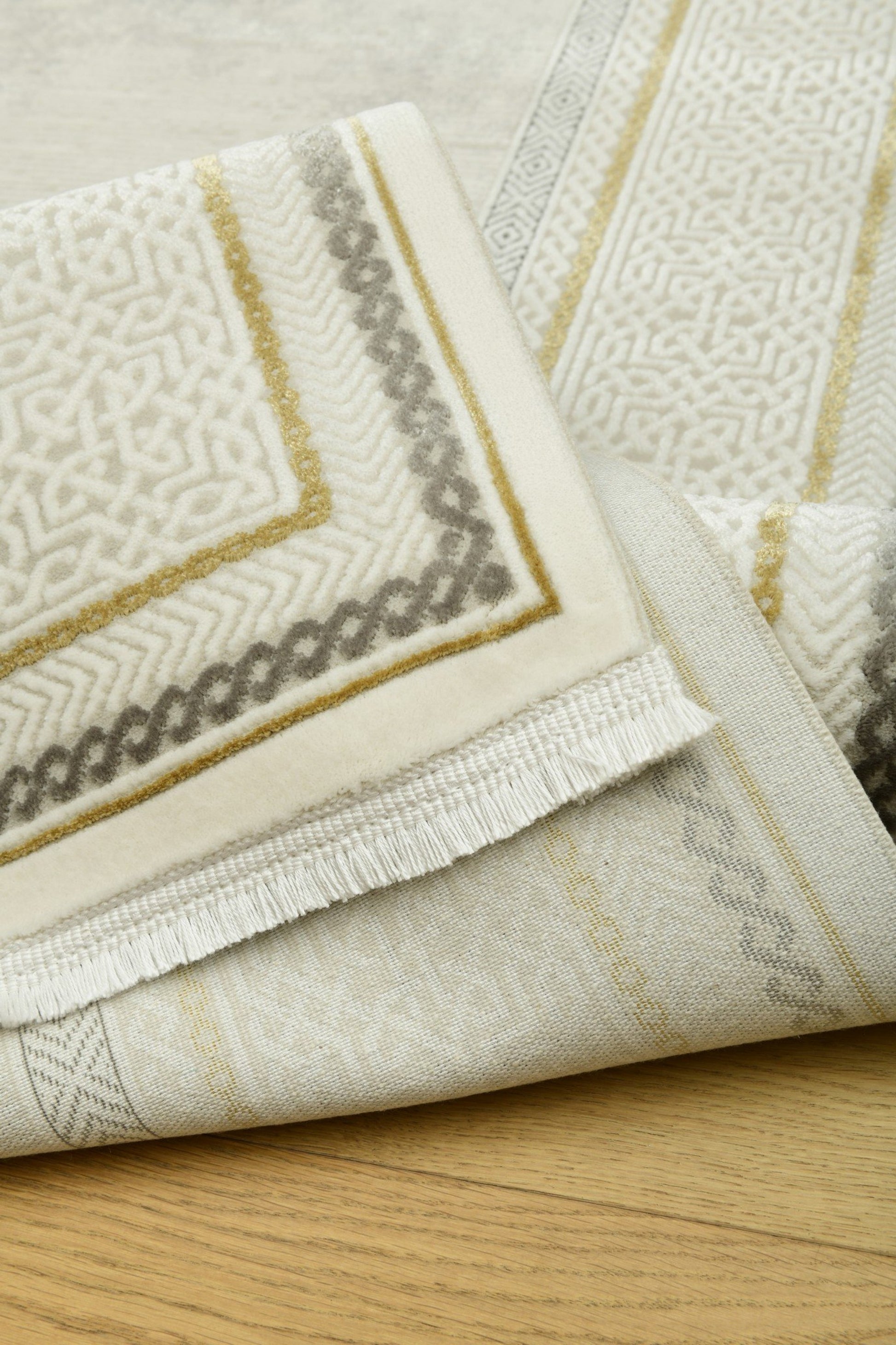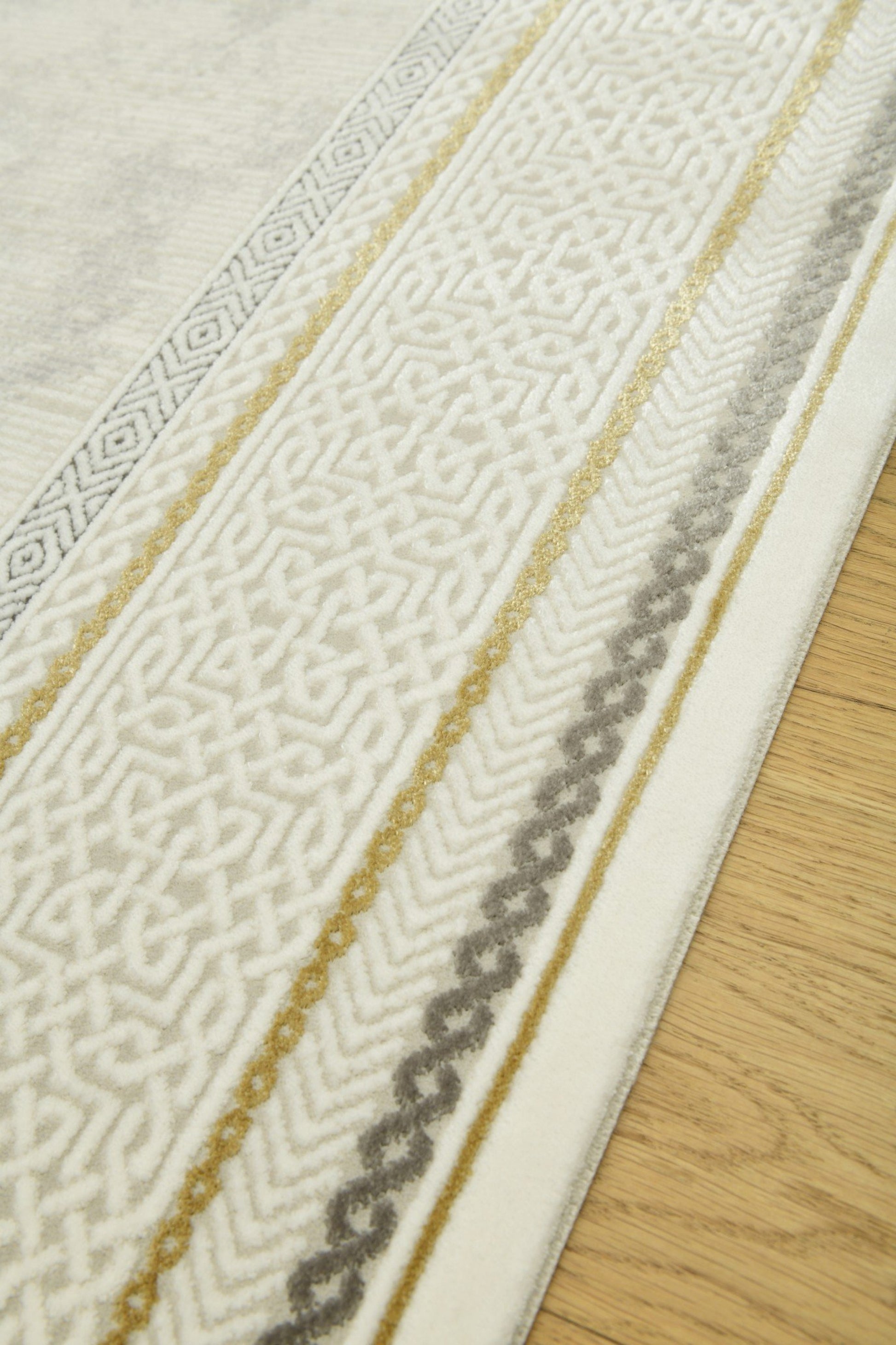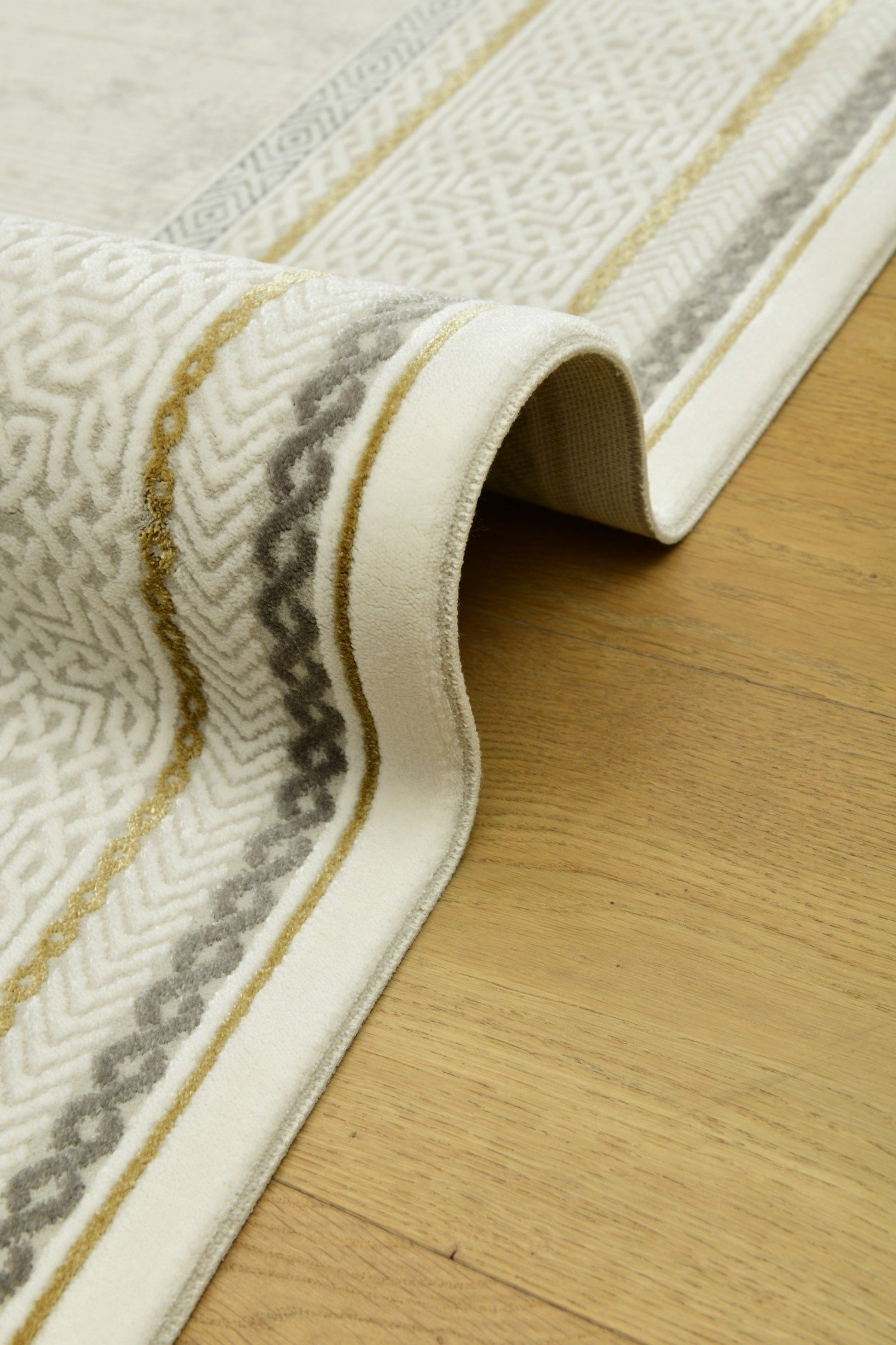 Galata SandRam kombinerar enkelhet med raffinerade detaljer. Den ljusa mattan ramas in av en dekorativ sandfärgad bård med subtila geometriska mönster, vilket skapar ett harmoniskt och elegant uttryck utan att kännas tungt.