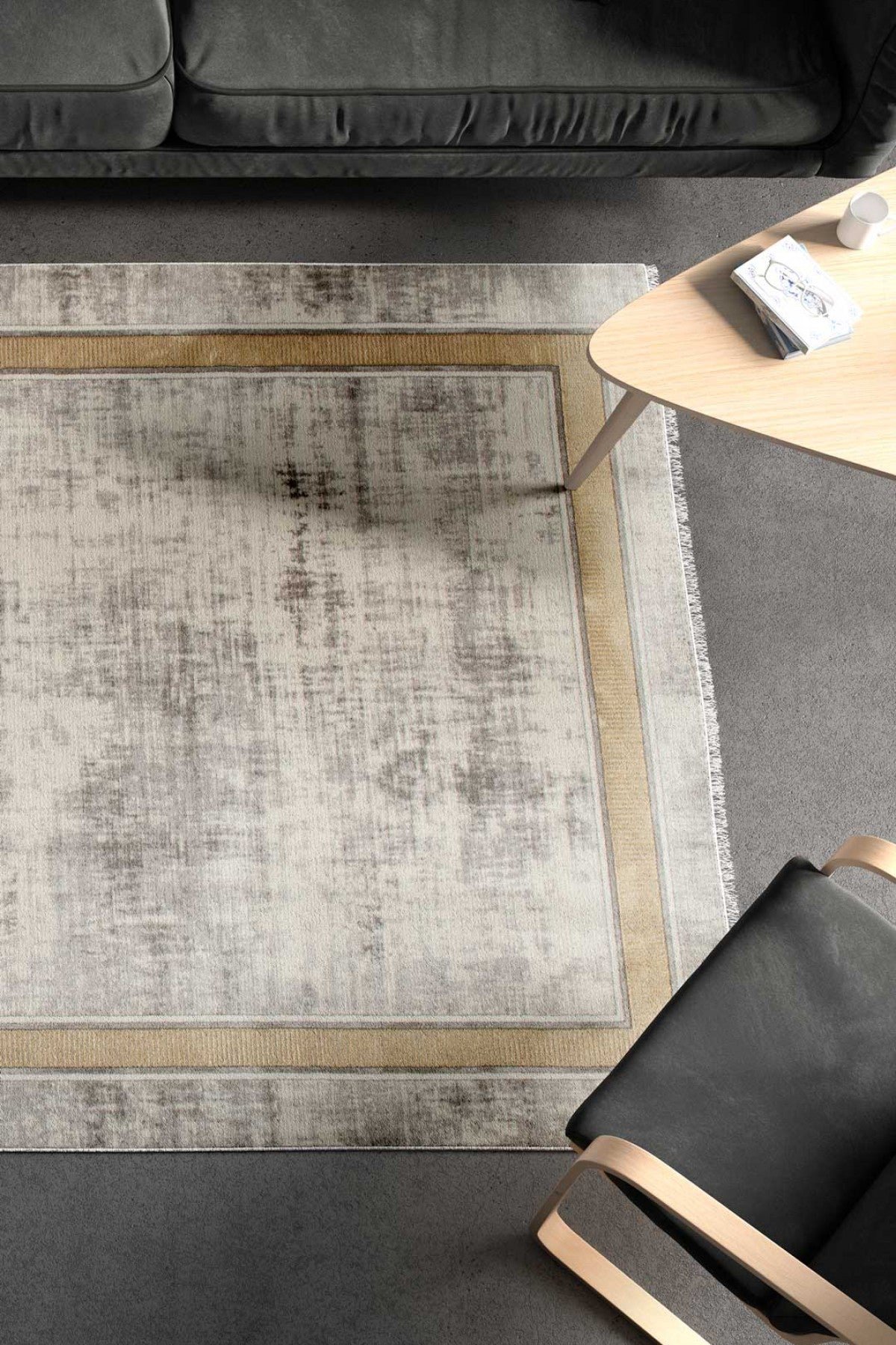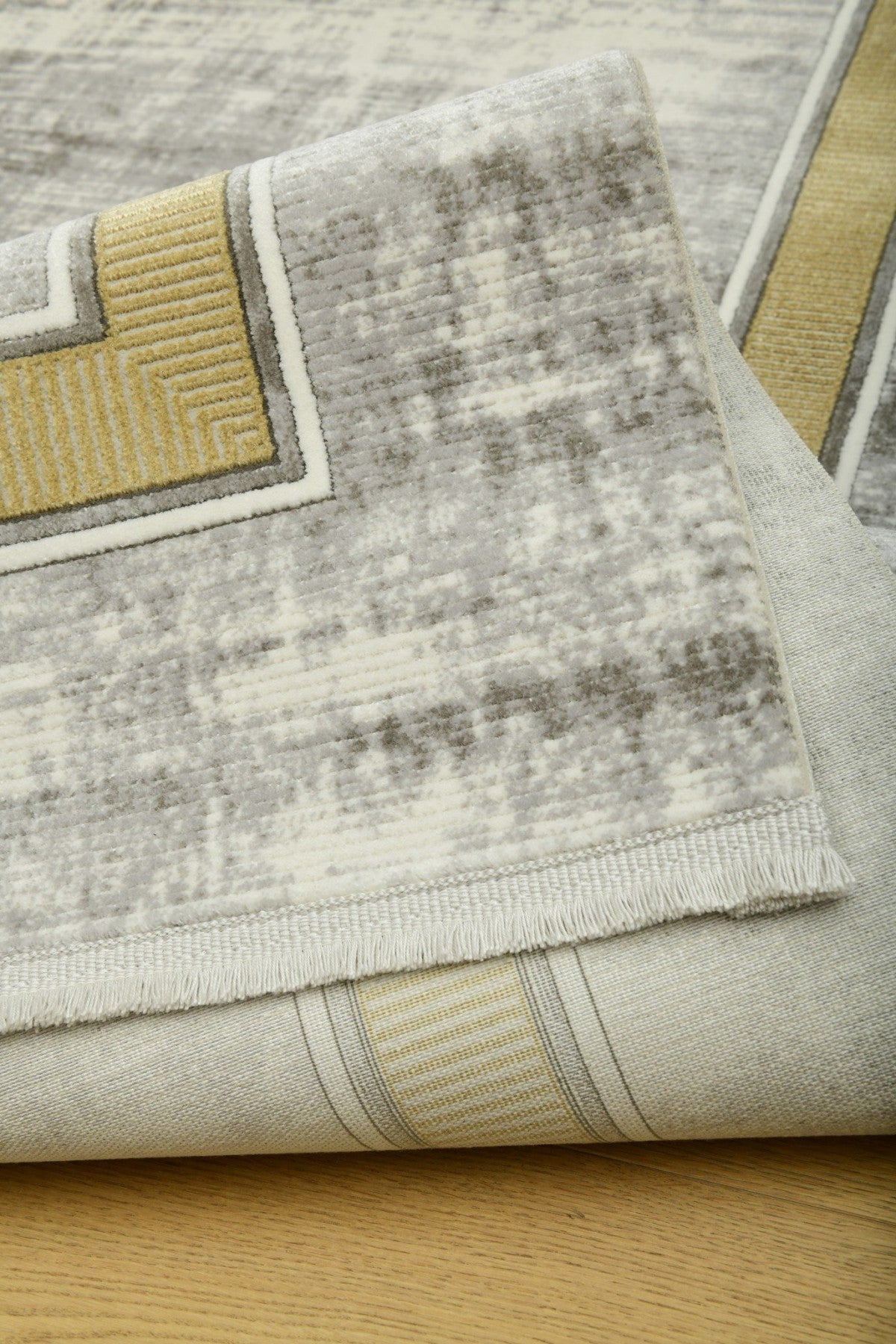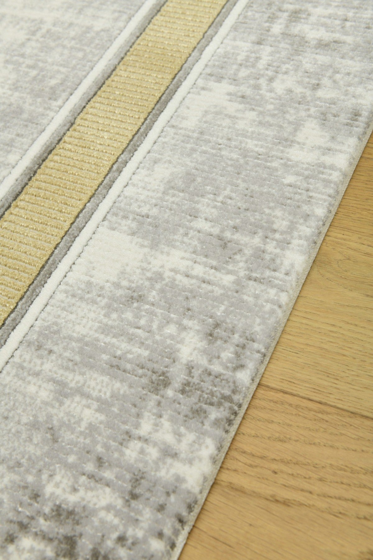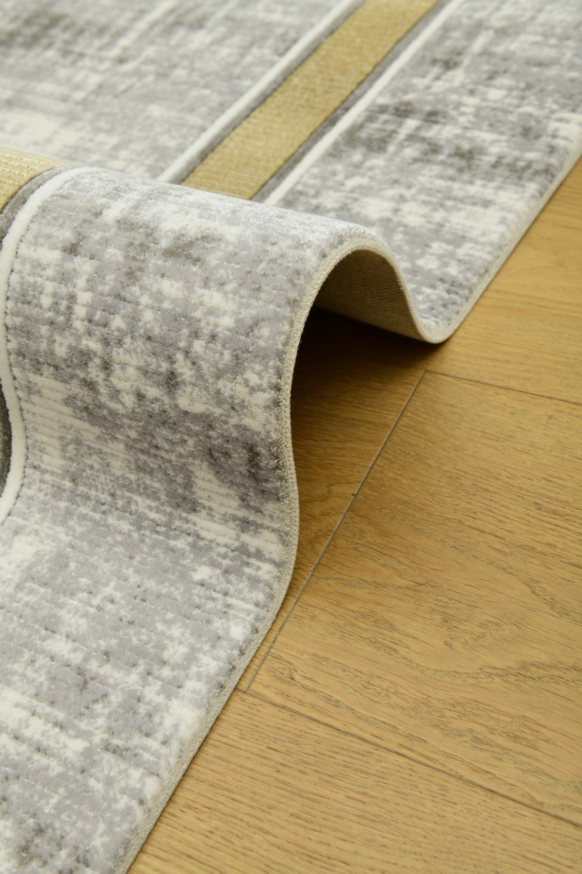 Galata LjusGuld kombinerar sofistikerad minimalism med en varm, gyllene ram. Den subtilt melerade ytan i grått och beige skapar en harmonisk bas, medan den dekorativa guldkanten tillför elegans och struktur.