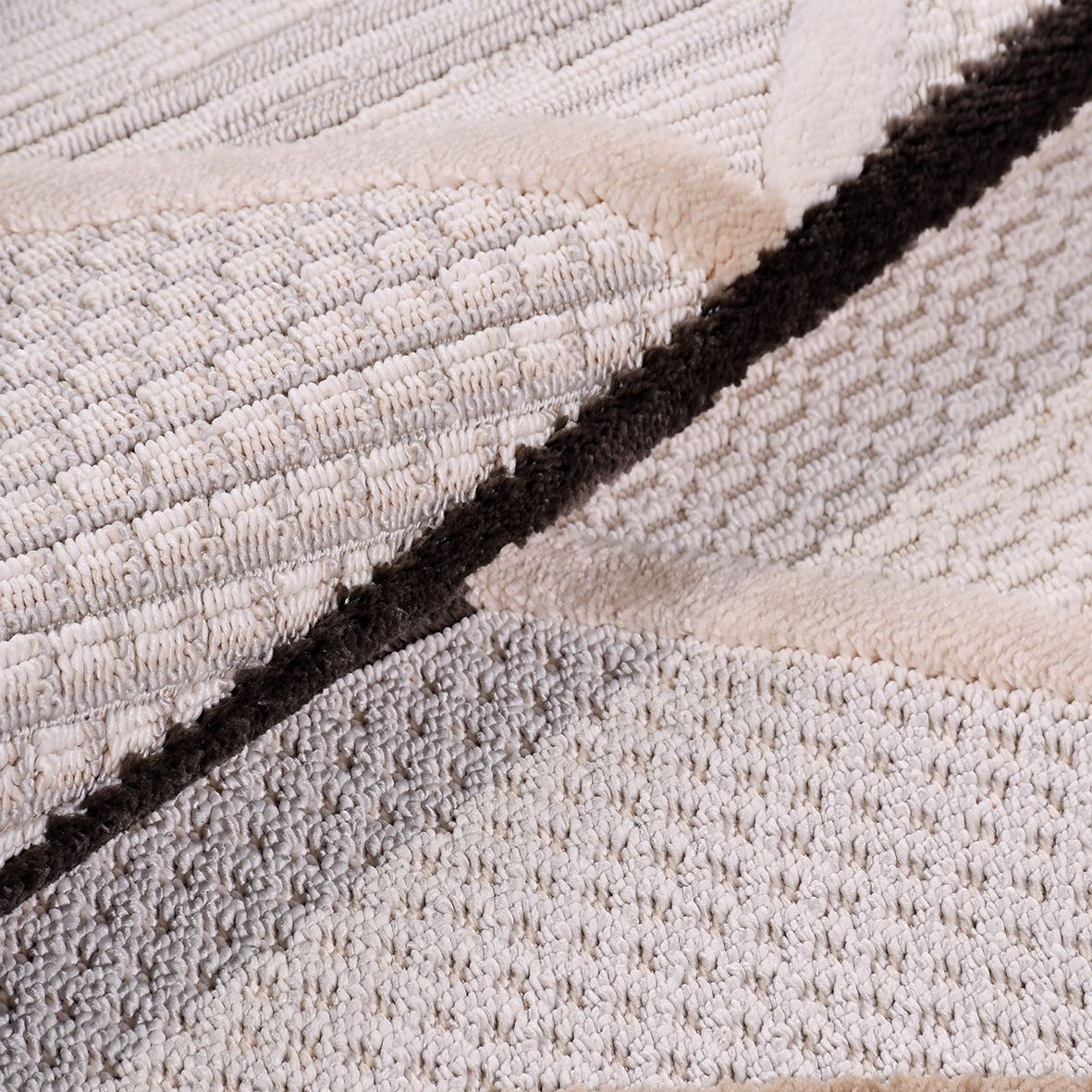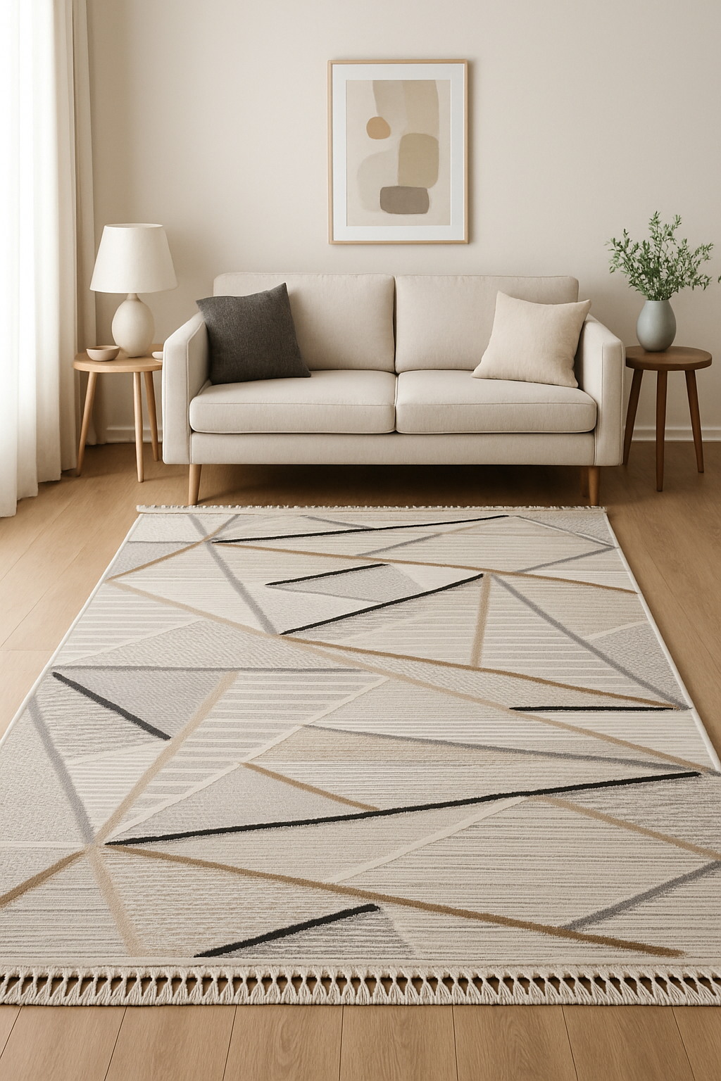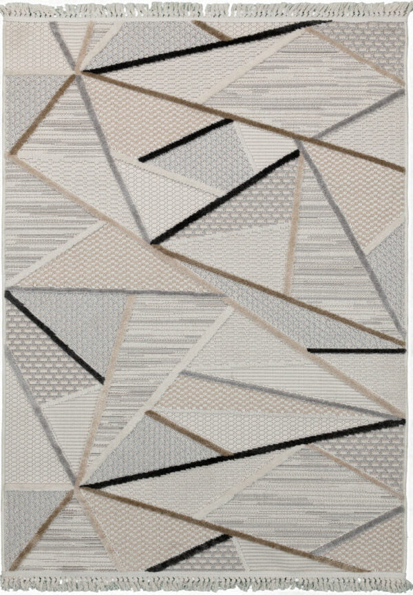 Izmir Almond är en djärv och modern matta som kombinerar geometrisk precision med subtil färgkontrast. Mönstret består av trianglar i varierade strukturer och jordnära toner – nu förstärkt med mörka accenter i svart och brun som skapar en distinkt, sofistikerad känsla.