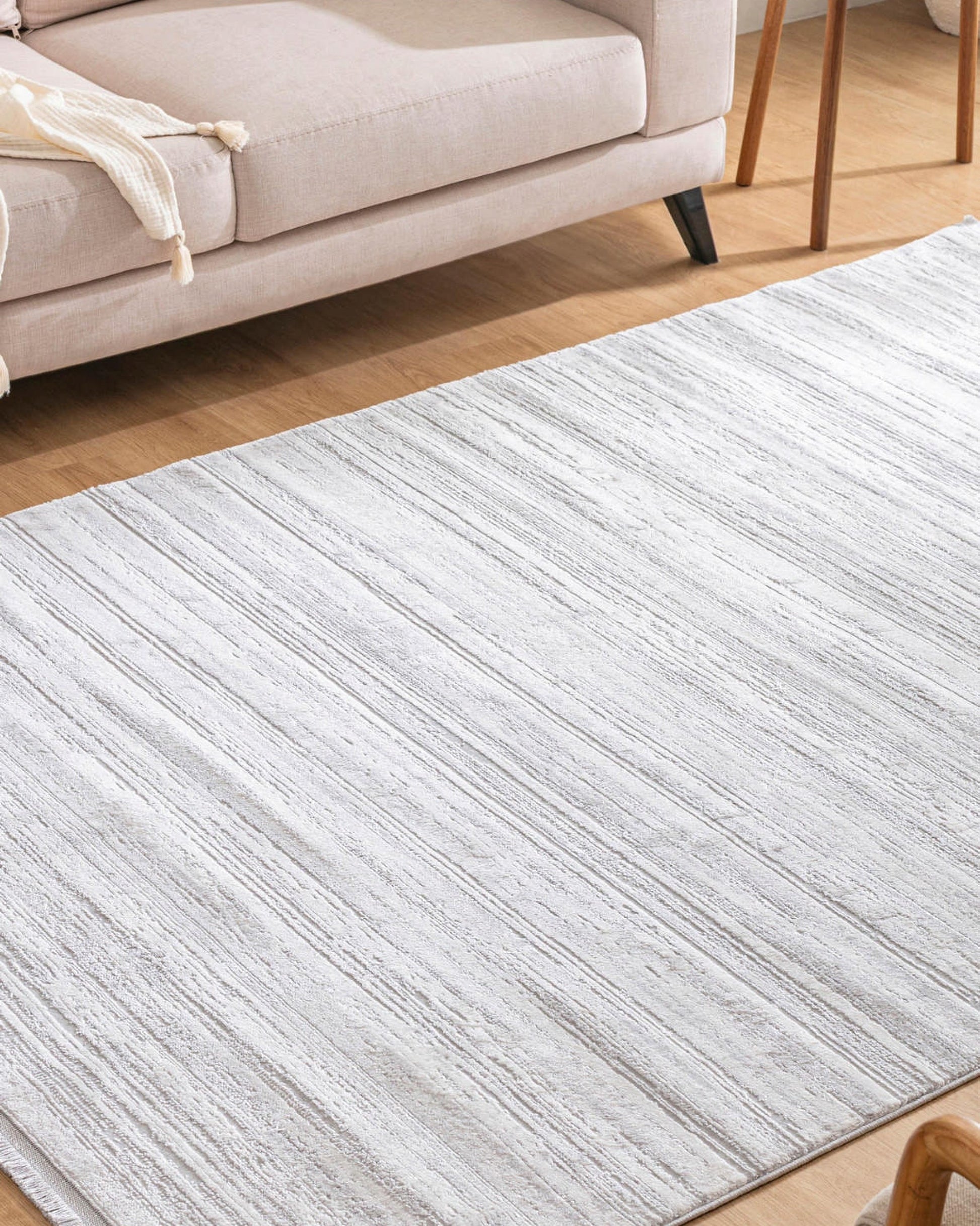 Juliet Linstruktur fångar det enkla och eleganta i naturens egna linjer. De subtila längsgående ränderna i olika nyanser av vitt och ljust grått ger mattan en lugnande rytm och ett mjukt uttryck.