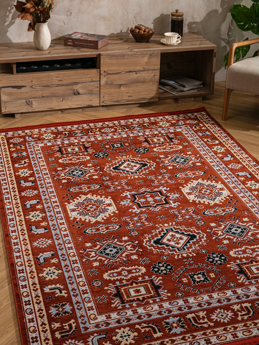 Med brända terrakottatoner, detaljer i svart, elfenben och himmelsblått, berättar mattan en historia av anatoliska traditioner och konstnärlig balans – perfekt för dig som söker ett uttrycksfullt men harmoniskt intryck i hemmet.