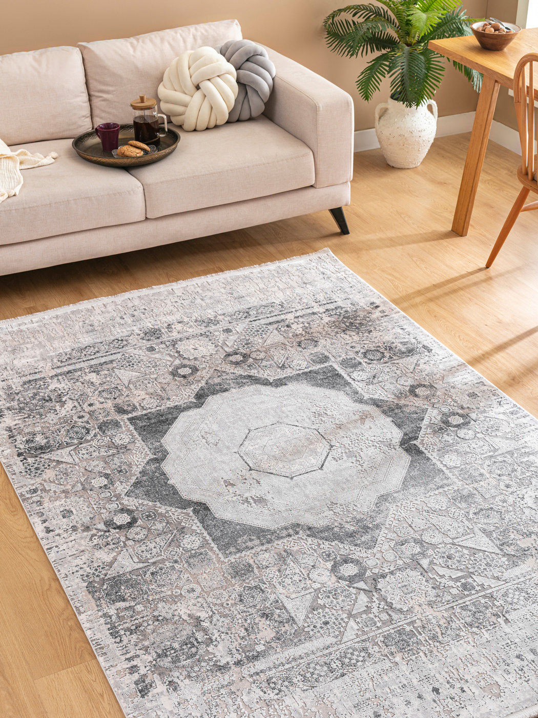 Mattans dämpade grå och ljusbeige toner skapar en lugn, tidlös känsla och passar både moderna och traditionella hem. Ett utmärkt val för dig som vill kombinera kulturhistoria med nutida estetik.