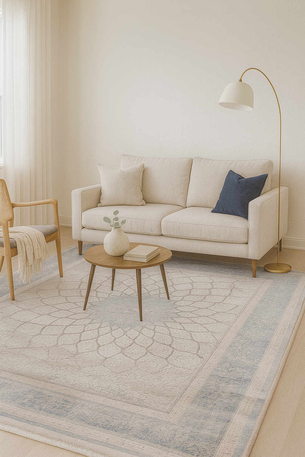 De blekblå och ljusgrå nyanserna skapar en sval men mjuk känsla, vilket gör denna matta till en perfekt grund i skandinaviska interiörer med ljus färgpalett.