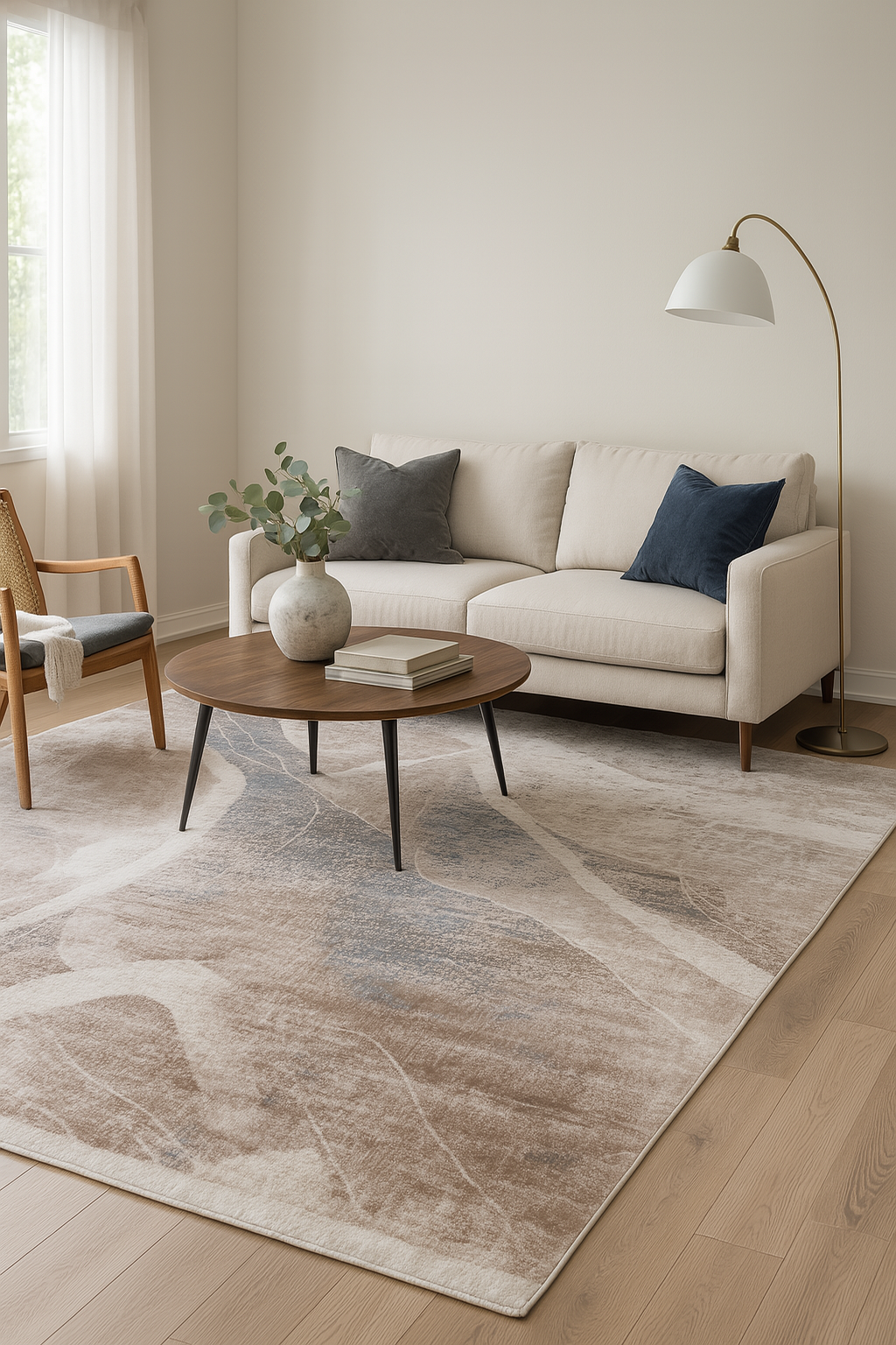 Nazenin JordFlöde bär naturens spår i varje linje och nyans. Med inspiration från jordens organiska mönster och flödande former, skapar denna matta en konstnärlig och jordnära känsla i rummet. De dämpade tonerna av beige, grått och blått harmoniserar med varma och kalla inredningar.