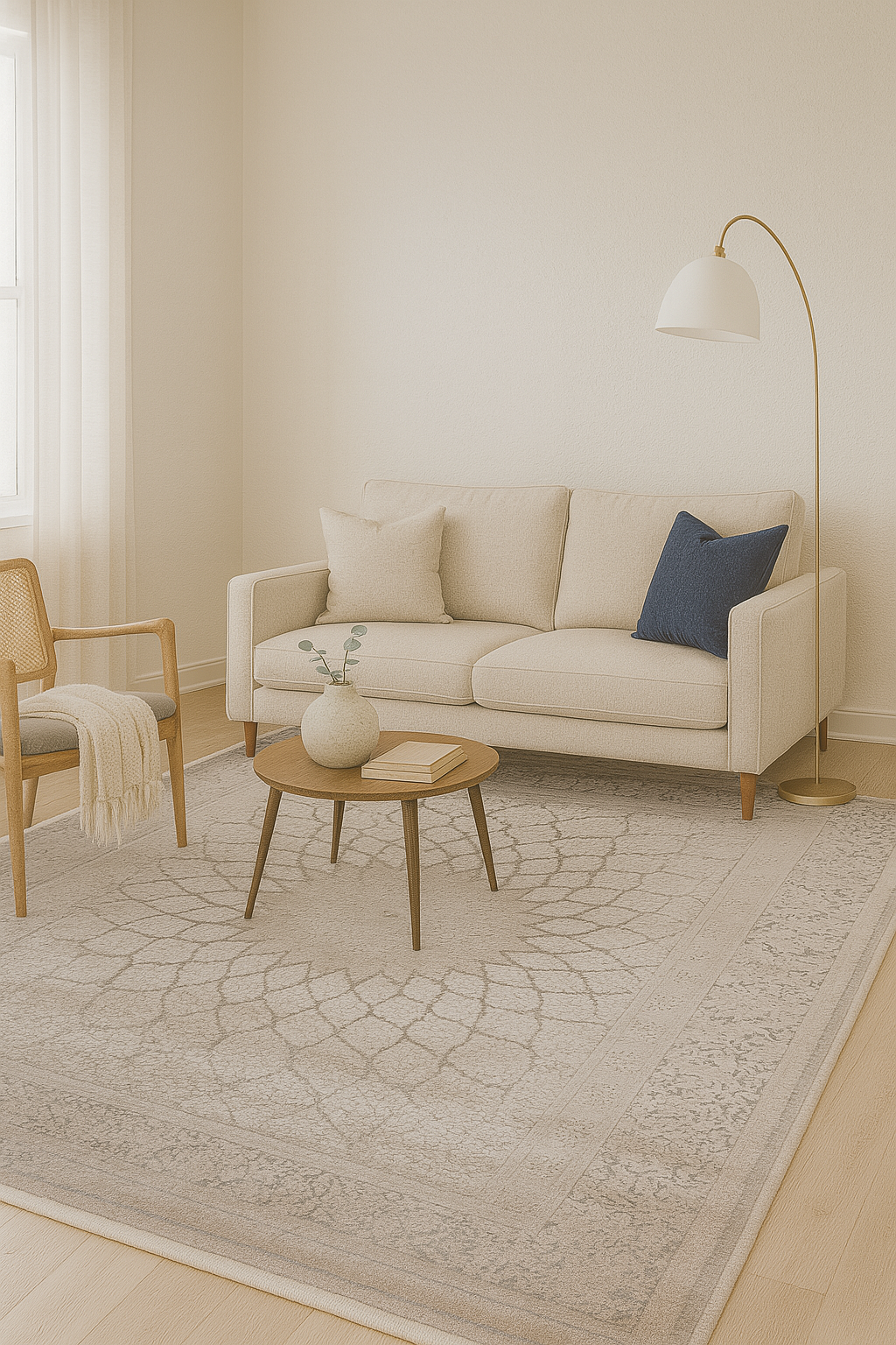 Bloom Stjärnväv – En elegant kombination av klassisk medaljong och moderna gråblå toner