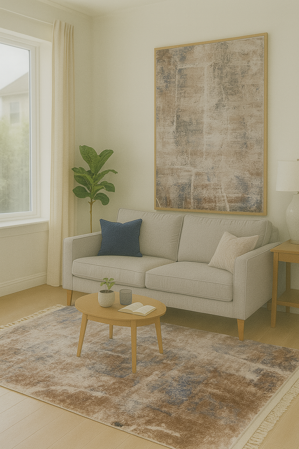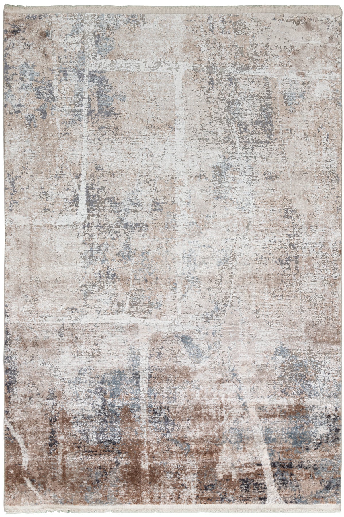 Nazenin MarkSilke kombinerar rustik karaktär med en silkeslik yta, vilket skapar en matta som både känns naturlig och exklusiv. Det abstrakta mönstret i dämpade nyanser av beige, brun och blått för tankarna till jordytor och stenformationer, vilket gör den till ett konstnärligt tillskott i varje rum.
