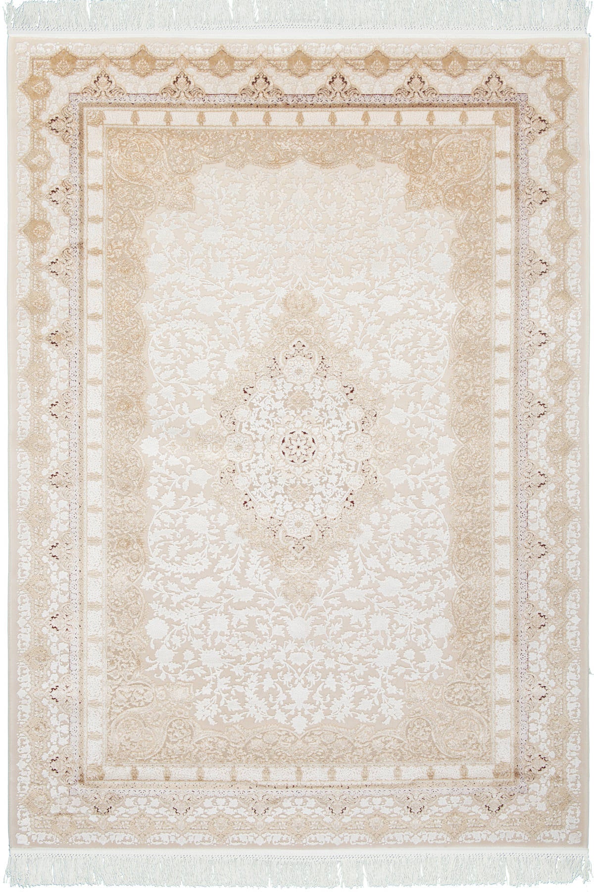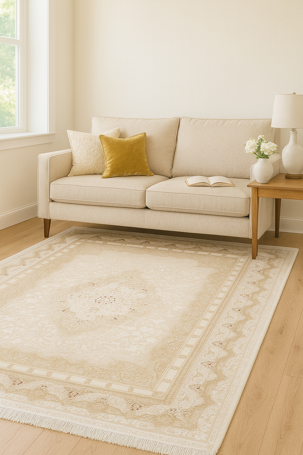 Nilüfer GuldRos är en hyllning till orientalisk hantverkskonst i en mjuk och harmonisk färgpalett. Det eleganta medaljongmönstret i elfenben vilar mot en varm beige bakgrund, inramad av subtila guldtoner som skapar ett majestätiskt men lugnt uttryck.