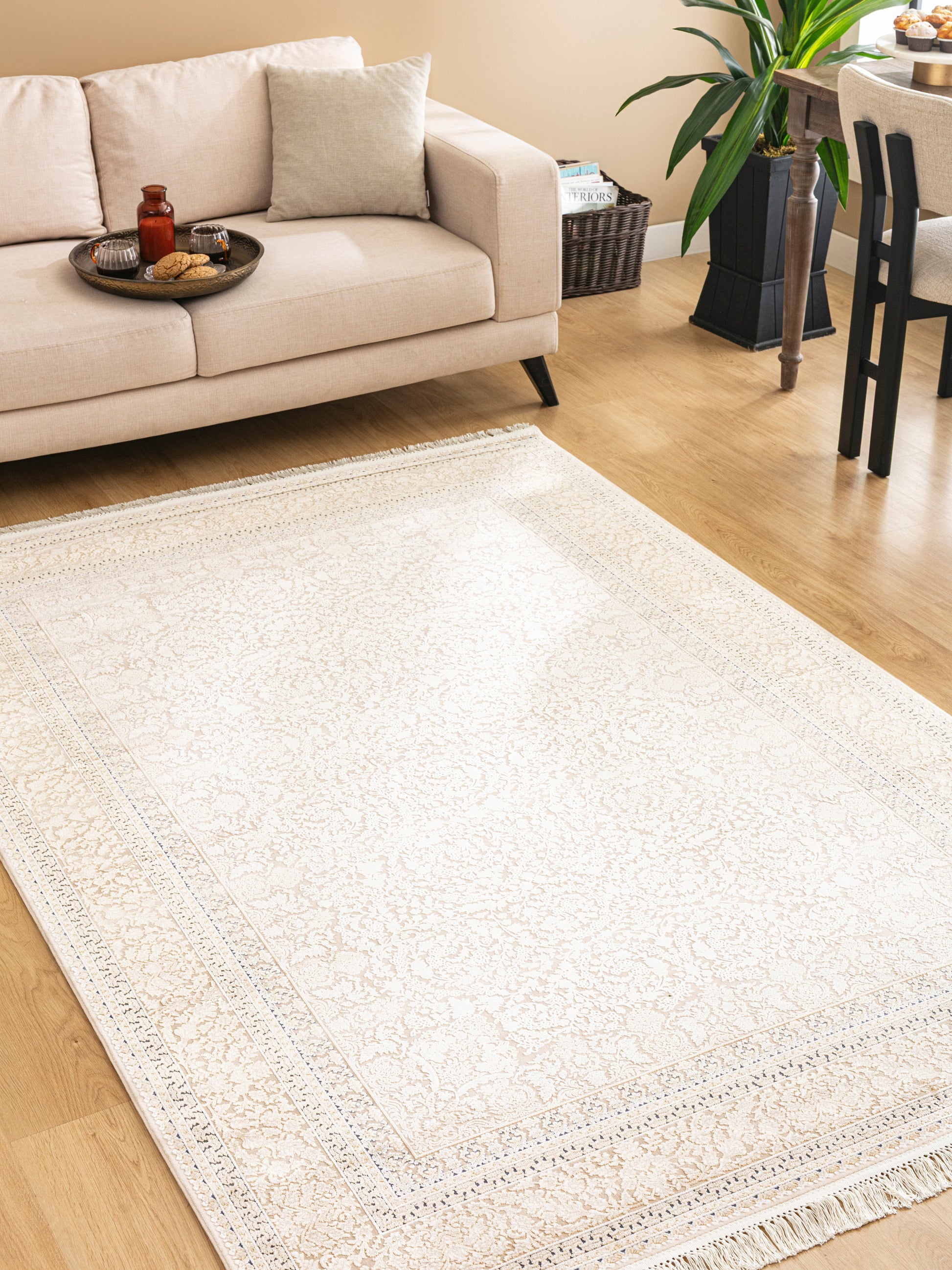 Nilüfer SidenRam är en klassisk matta med utsökt detaljrikedom och en sofistikerad ramdesign. Den silkiga texturen i beige och elfenbenstoner utstrålar elegans och lugn, perfekt för rum där harmoni och stil är i fokus.