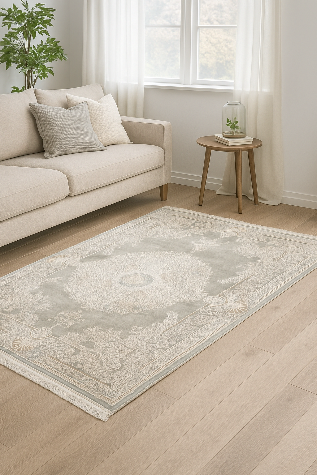 Novella Silverblom är en elegant matta med ett storslaget medaljongmönster som andas klassisk lyx. Den dämpade silvergröna botten skapar ett lugnt intryck medan den vita ornamentiken lyfter fram detaljrikedomen.