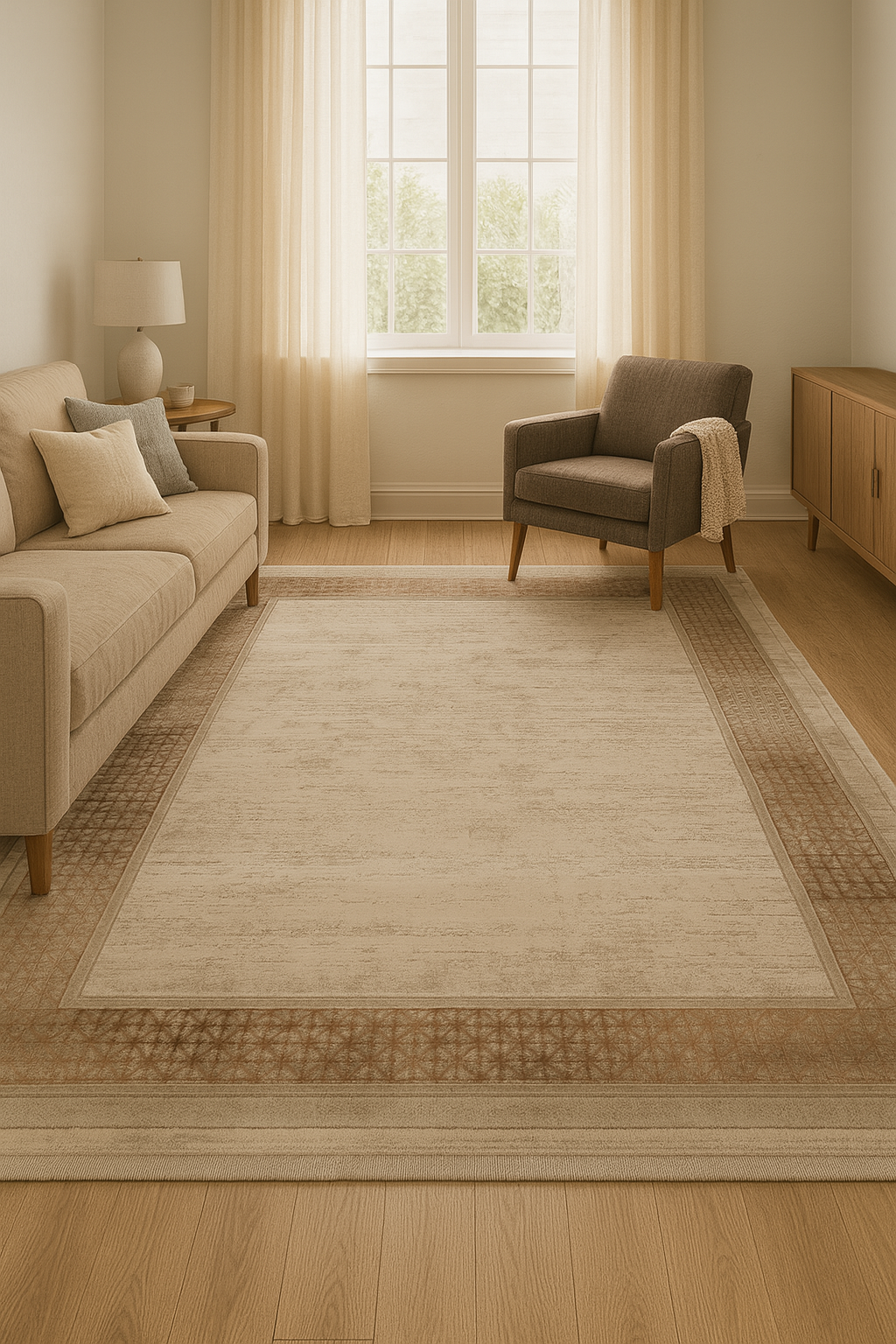 Picasso Sand är en elegant matta som utstrålar harmoni och värme. Den lugna beigea ytan ramas in av ett geometriskt mönster i sandbruna toner – en subtil men iögonfallande detalj som förhöjer rummets uttryck.