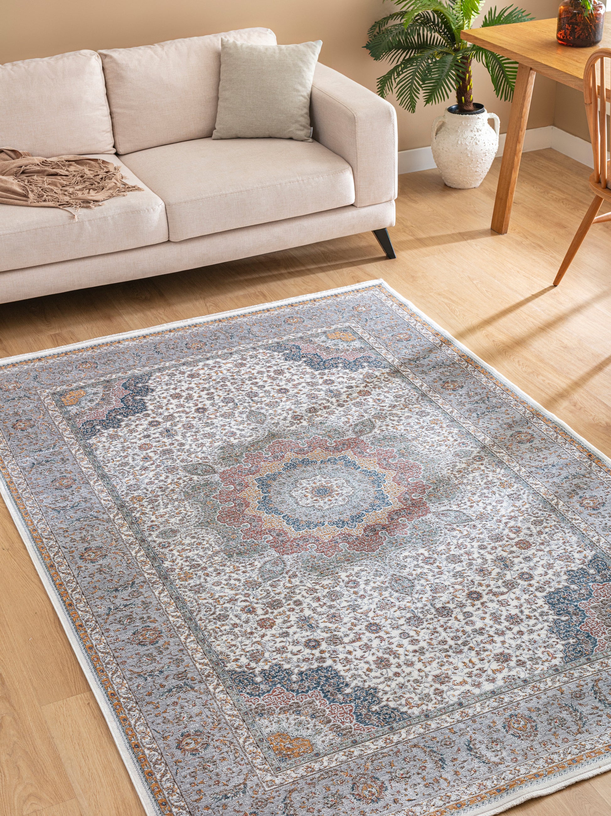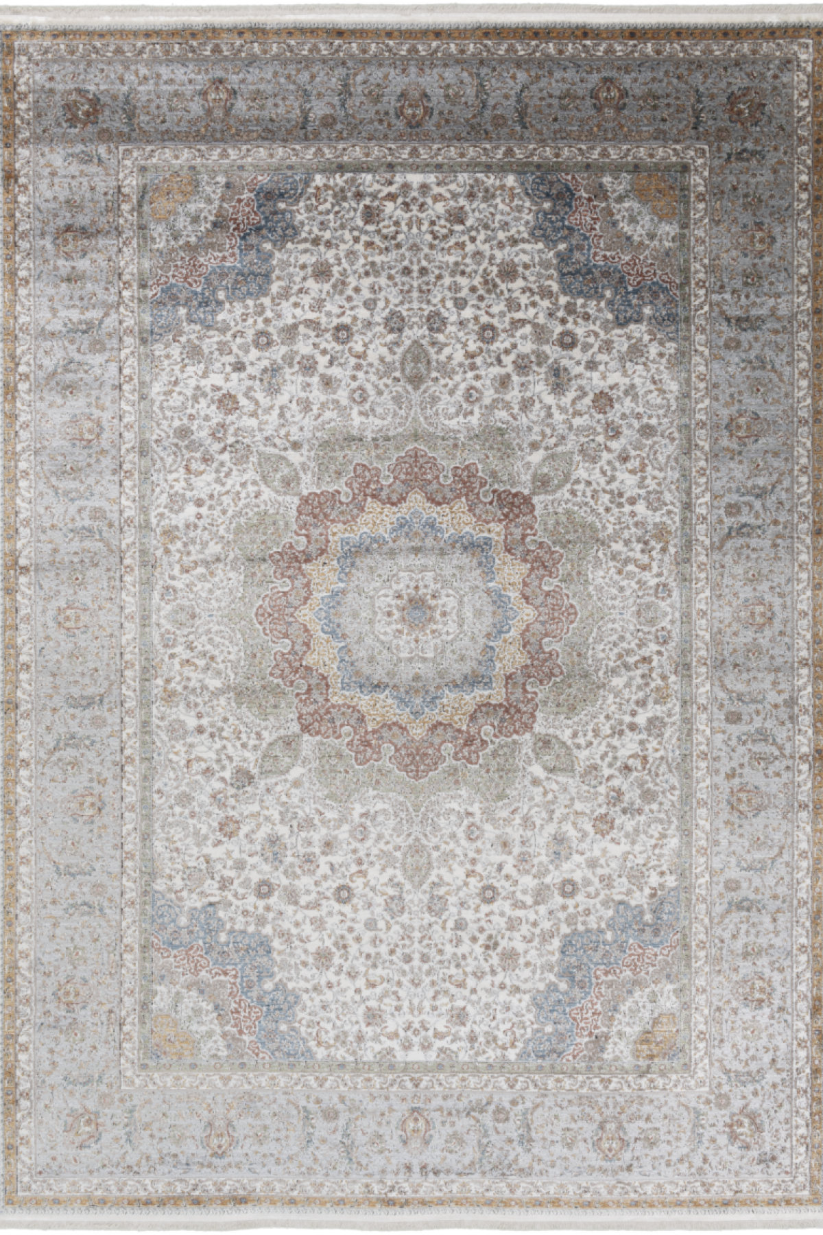Renaissance Medaillon är en majestätisk matta med ett detaljerat mittmotiv som för tankarna till traditionell persisk konst. Färgpaletten väver samman milda toner av blått, vinrött, guld och olivgrönt på en ljus bas, vilket ger mattan ett sofistikerat men levande uttryck.