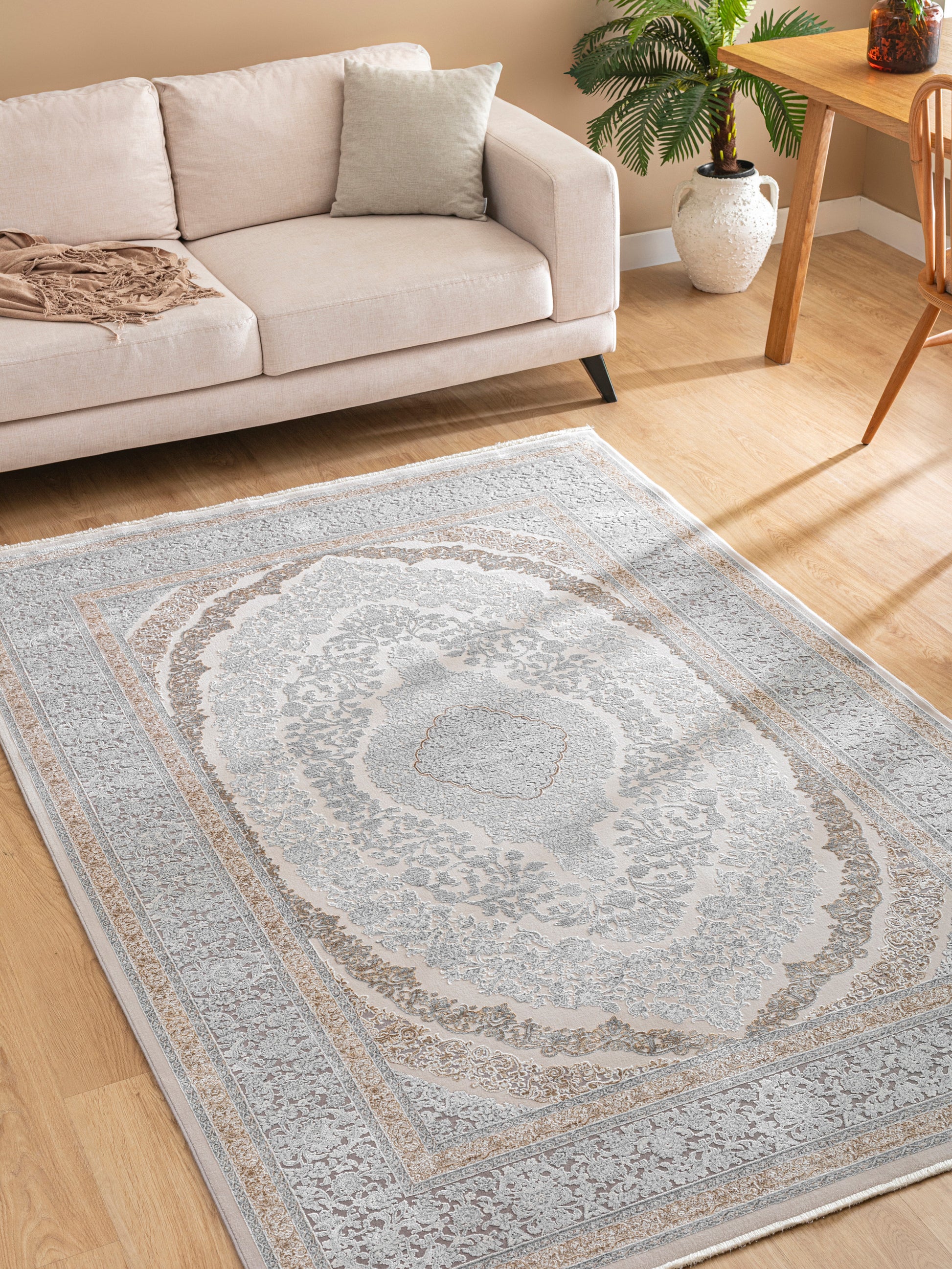 Renaissance Safvit är en hyllning till tidlös orientalisk konst med ett uppdaterat uttryck i ljusa nyanser. Det centrala medaljongmönstret ramas in av intrikata blomsterramar i silver, elfenben och champagnebeige – vilket ger mattan en kunglig och sofistikerad karaktär.
