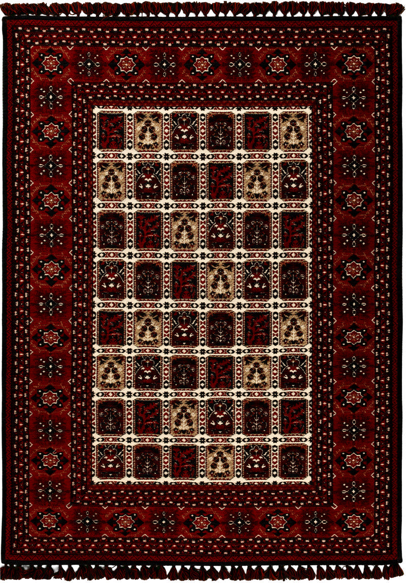 Türkmen Rubinia utmärker sig med sitt rika rutmönster i bordeaux och elfenbensvitt – en design som för tankarna till orientens historiska palats. Denna matta kombinerar traditionell charm med modern funktionalitet för dagens hem.