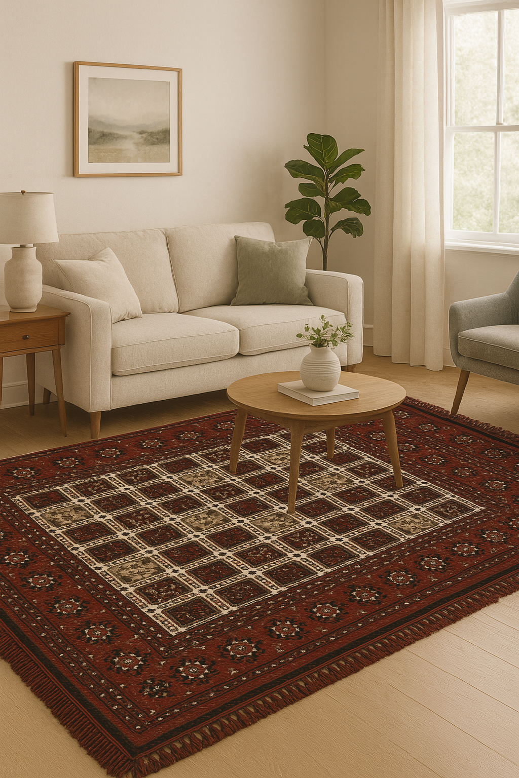 Türkmen Rubinia – Praktisk Matta med Klassiska Orientaliska Rutor